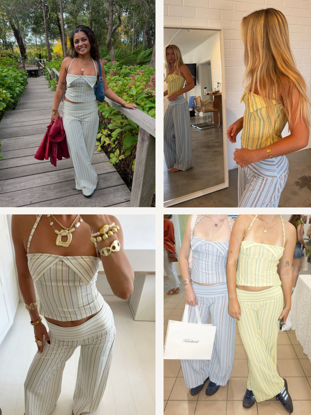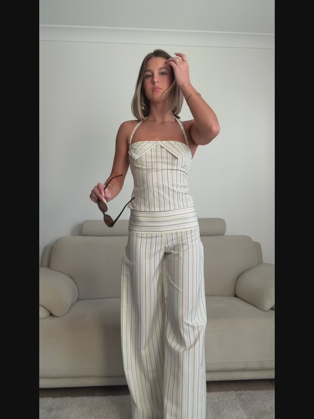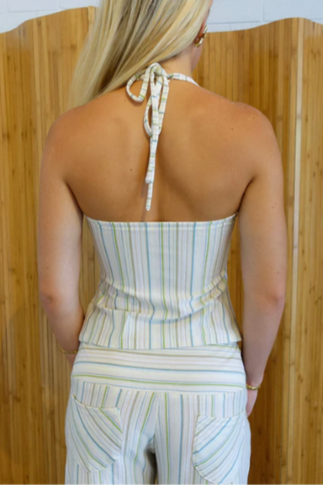 Elevate your style with this chic and summery set. Featuring a fitted bustier top with thin straps and wide-leg striped pants, it offers a look that is both modern and comfortable. The vertical stripes elongate the silhouette, while the flowy cut of the pants ensures optimal freedom of movement. Perfect for daytime outings or relaxed evening events, this set embodies effortless casual elegance.