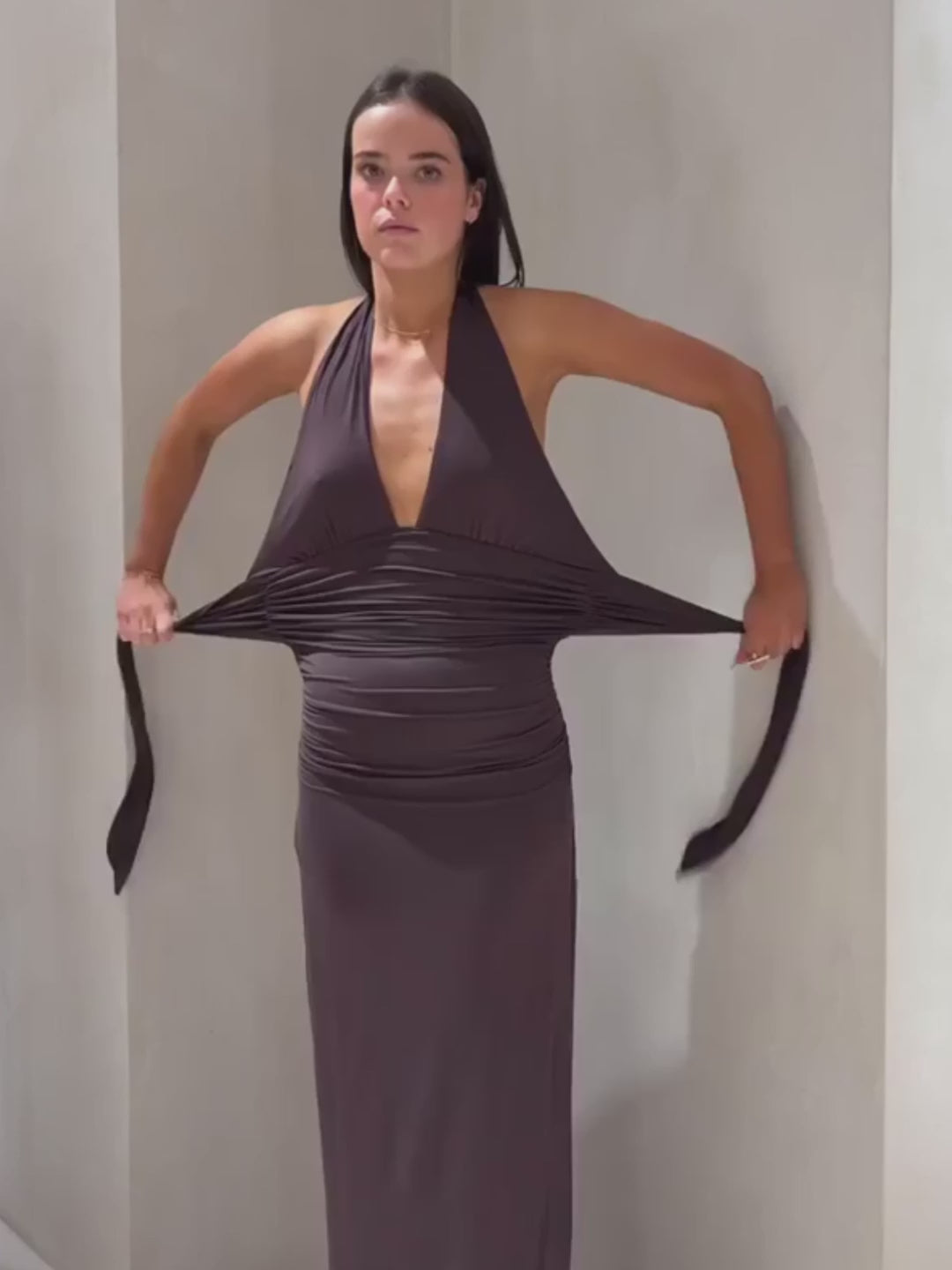 Turn heads at any event with this stunning maxi dress featuring a plunging neckline and a flattering, body-hugging silhouette. Designed to enhance your natural curves, it blends sophistication and sensuality with a sleek, minimalist edge.